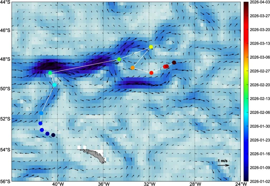 風(fēng)云衛(wèi)星監(jiān)測的A23a冰山漂移路徑(圓點為冰山位置,時間與右側(cè)標(biāo)注對應(yīng);圖底色和箭頭表示洋流)。(中國氣象局供圖)