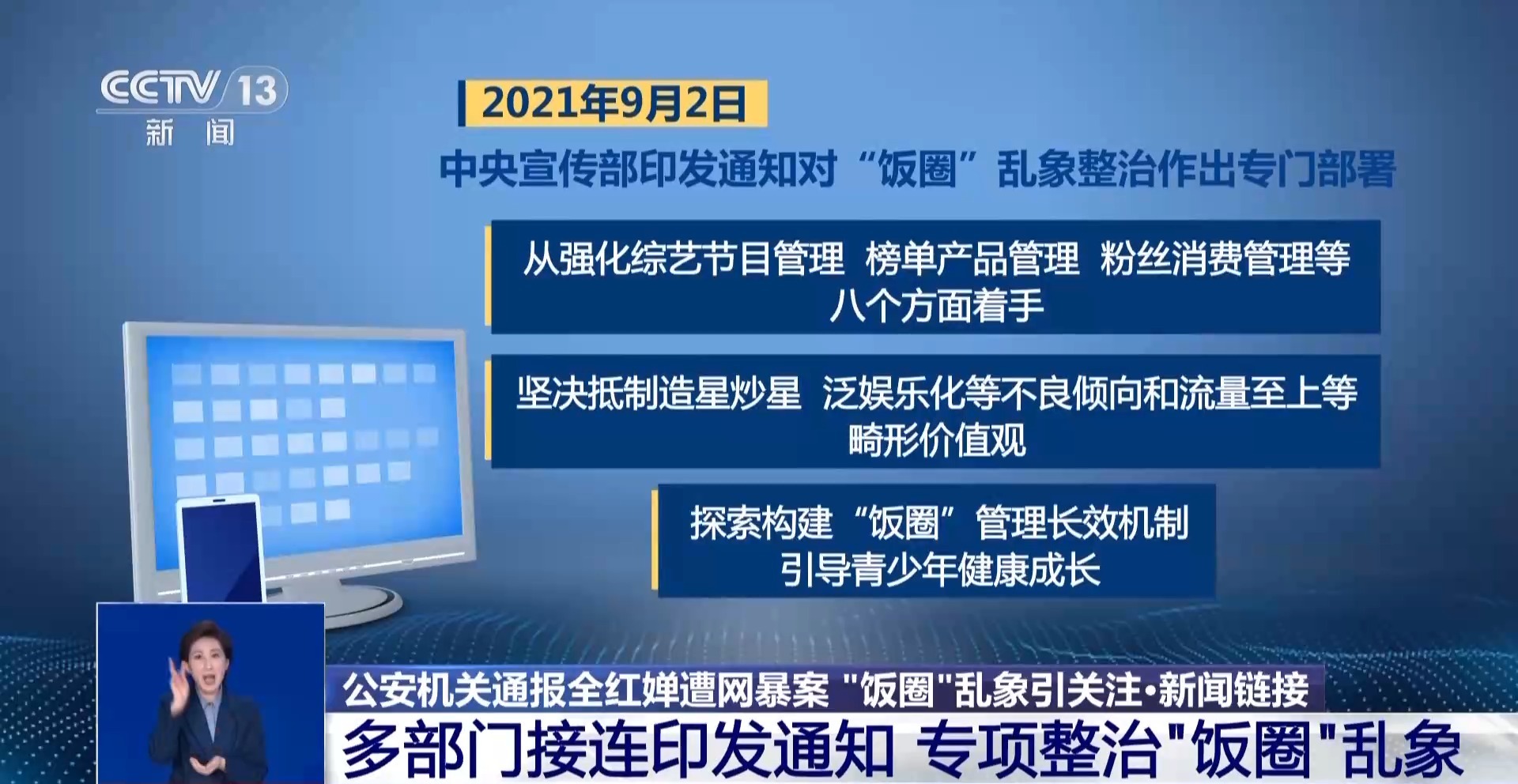 2021年9月2日,中央宣傳部印發(fā)通知對“飯圈”亂象整治作出專門部署。從強化綜藝節(jié)目管理、榜單產(chǎn)品管理、粉絲消費管理等八個方面著手,堅決抵制造星炒星、泛娛樂化等不良傾向和流量至上等畸形價值觀,探索構(gòu)建“飯圈”管理長效機制,引導(dǎo)青少年健康成長。
