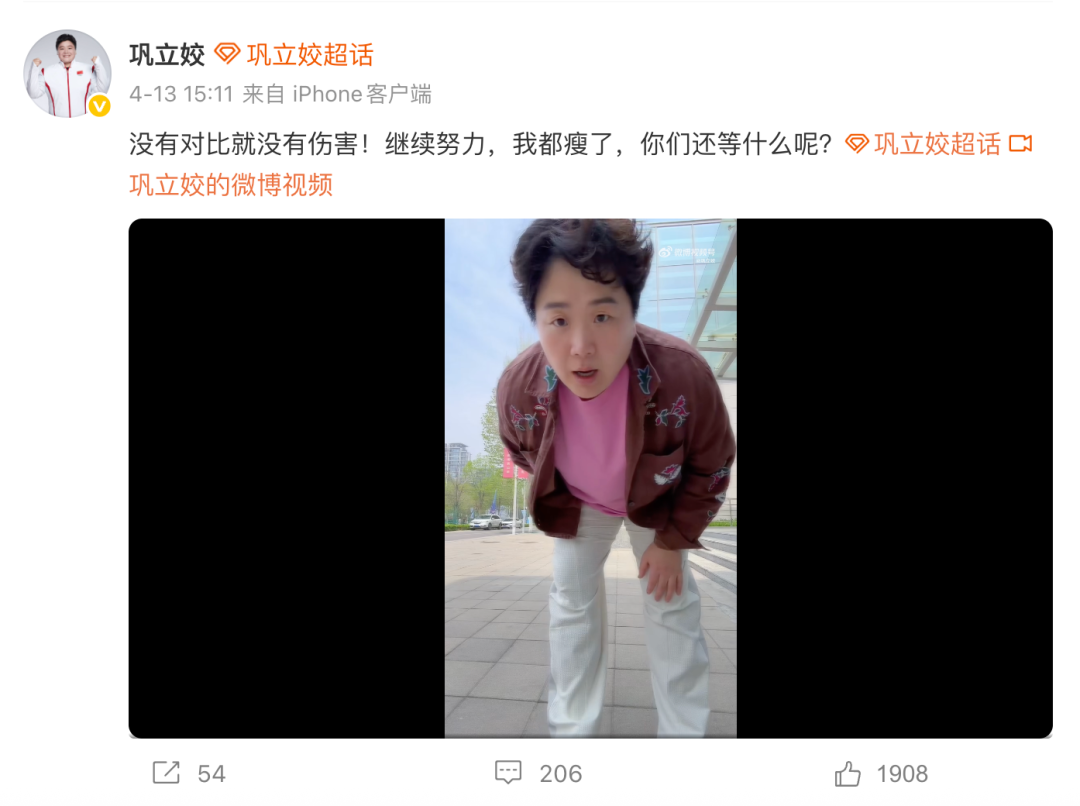 從退役到現(xiàn)在,不到5個月的時間,鞏立姣已經(jīng)從220斤減到180斤左右。有網(wǎng)友詢問鞏立姣是怎么瘦下來的,其回復稱,等她再減一點,給大家出教程。