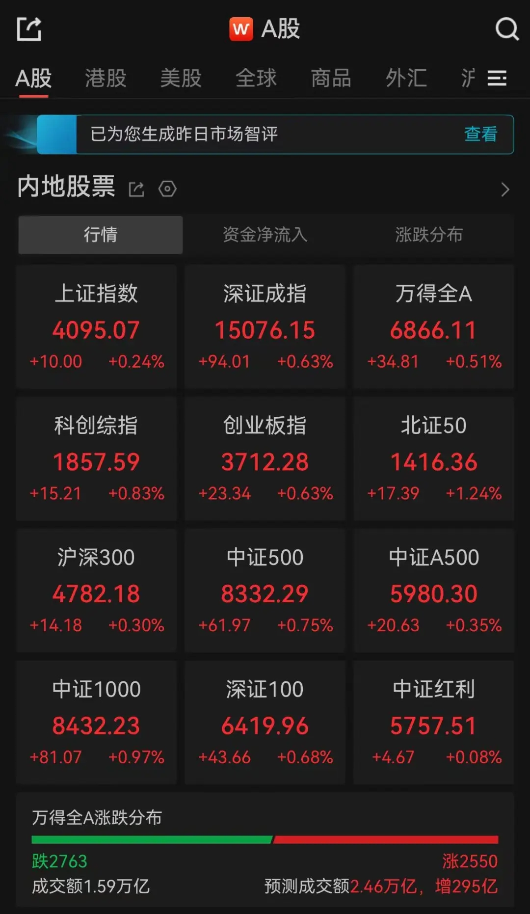 22日,A股三大指數(shù)低開后震蕩上行,集體翻紅。截至午間收盤,滬指漲0.24%,深證成指漲0.63%,創(chuàng)業(yè)板指漲0.63%。全市半日成交額1.59萬億,超2700只個(gè)股下跌。