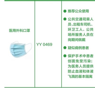 醫(yī)用外科口罩:防護(hù)效果優(yōu)于一次性使用醫(yī)用口罩,推薦公眾包括疑似病例患者、公共交通司乘人員、出租車司機(jī)、環(huán)衛(wèi)工人、公共場(chǎng)所服務(wù)人員在崗期間佩戴。該類型口罩還可保護(hù)手術(shù)中患者創(chuàng)面免受污染,可為醫(yī)務(wù)人員提供防止血液和體液飛濺的基本隔離。(橫列為口罩的圖片+名稱、產(chǎn)品標(biāo)準(zhǔn)、建議應(yīng)用場(chǎng)景。圖片來(lái)源:中國(guó)疾控中心)