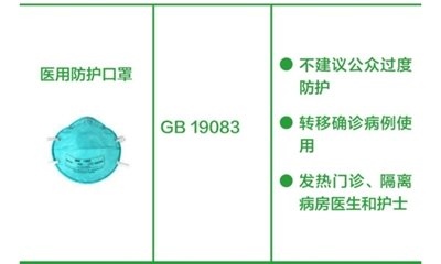 醫(yī)用防護(hù)口罩:推薦發(fā)熱門(mén)診、隔離病房醫(yī)護(hù)人員,以及確診新型冠狀病毒感染患者轉(zhuǎn)移使用。資源缺乏時(shí),不建議公眾過(guò)度防護(hù),可留給一線醫(yī)護(hù)人員使用。(橫列為口罩的圖片+名稱、產(chǎn)品標(biāo)準(zhǔn)、建議應(yīng)用場(chǎng)景。圖片來(lái)源:中國(guó)疾控中心)