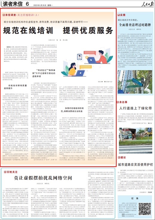 根據(jù)網(wǎng)友反饋的問題,6月26日,人民日報讀者來信版“來信調(diào)查”欄目刊發(fā)在線培訓調(diào)查報道《規(guī)范在線培訓 提供優(yōu)質(zhì)服務(wù)》,文中多處引用了人民網(wǎng)“人民投訴”平臺用戶相關(guān)案例和線索。