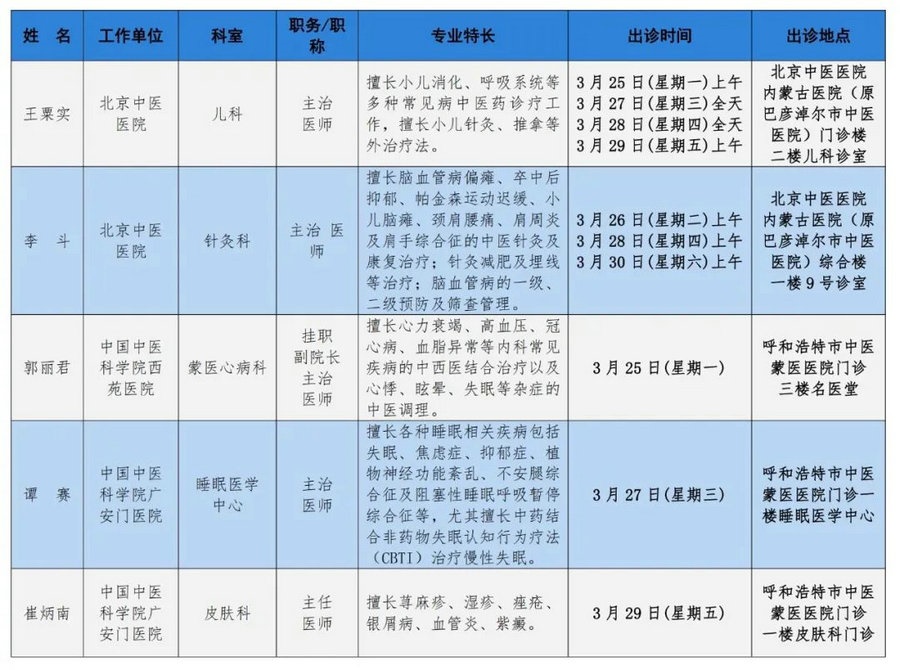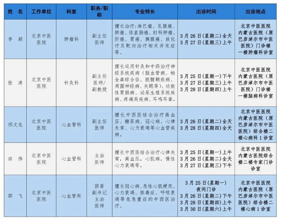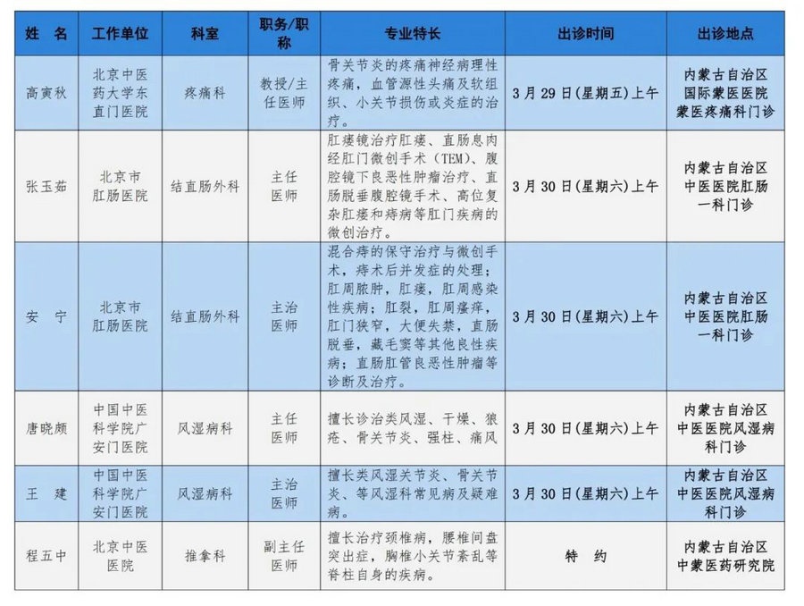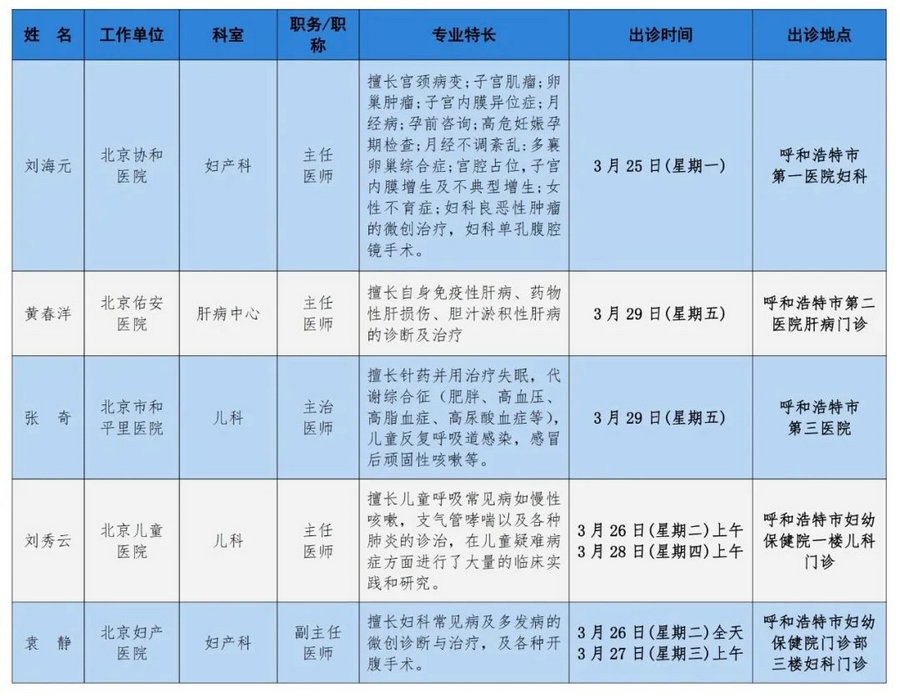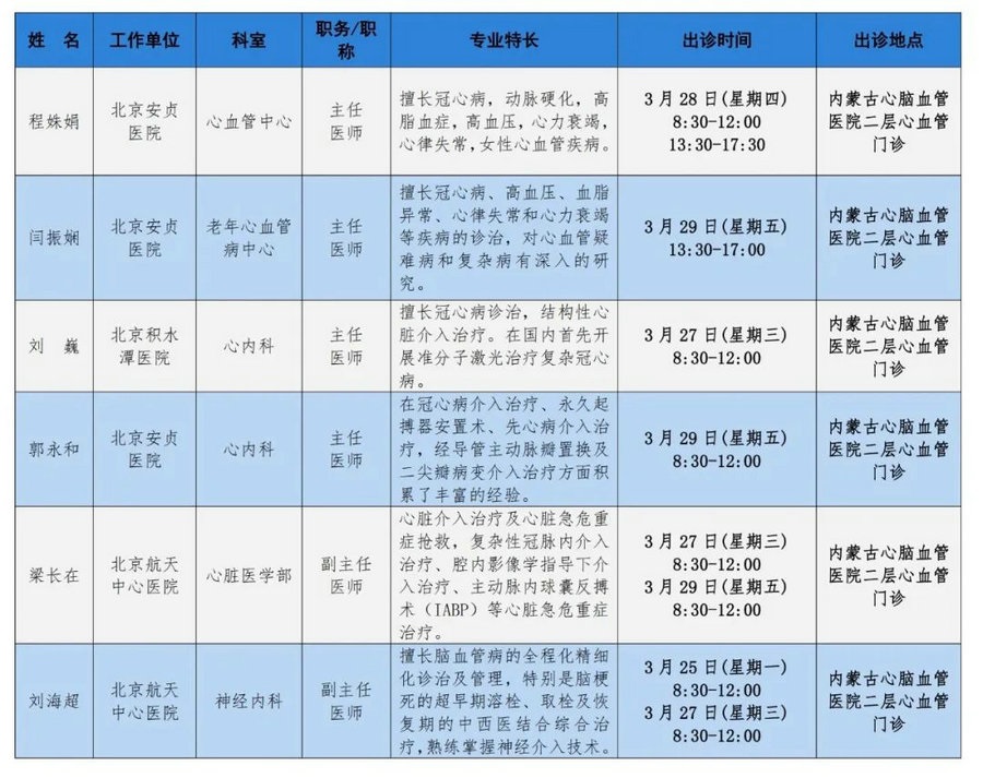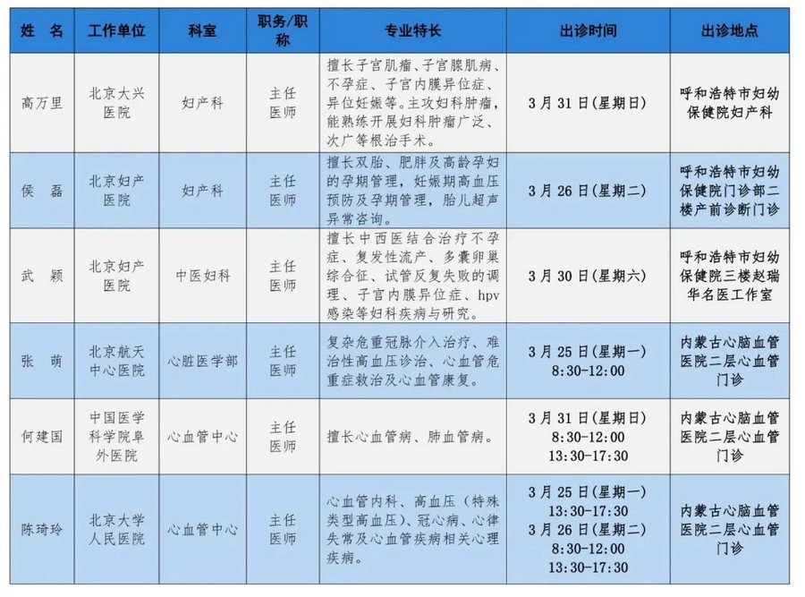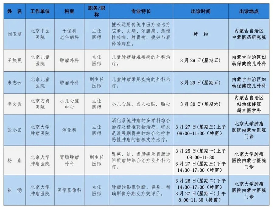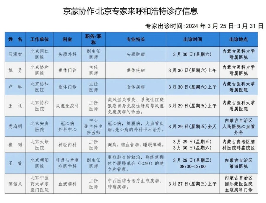京蒙協(xié)作 政協(xié)助力。每周有北京相關協(xié)作醫(yī)院專家來呼和浩特出診,現(xiàn)將本周專家出診信息予以發(fā)布。