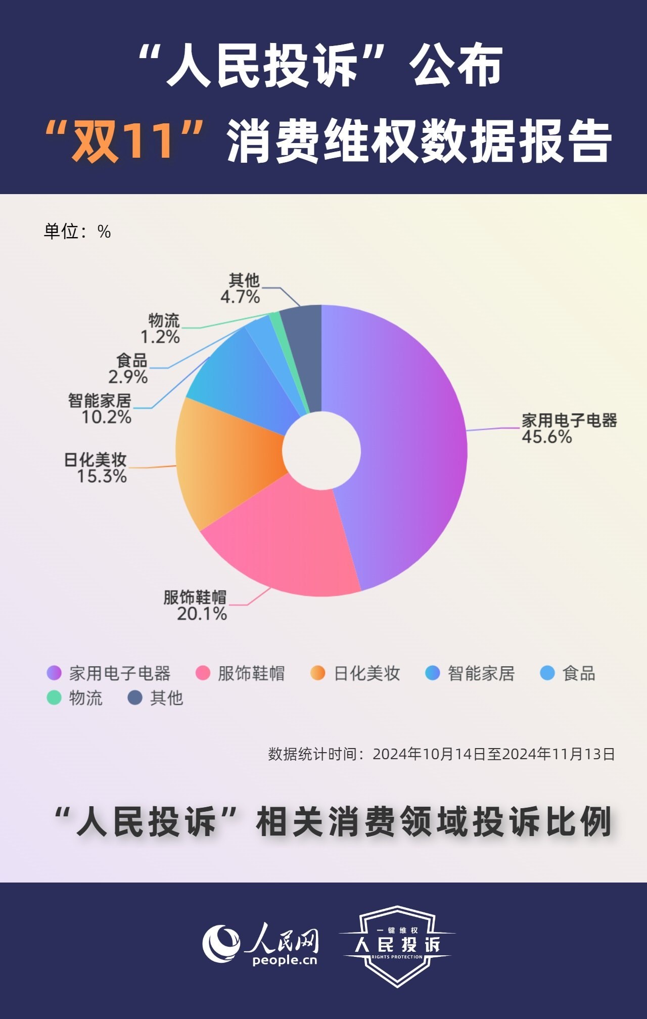 今年“雙11”期間,“人民投訴”主要消費(fèi)品類的投訴量占比:家用電子電器類(45.6%)、服飾鞋帽類(20.1%)、日化美妝類(15.3%)領(lǐng)域問題較多,其余依次為食品(2.9%)、物流(1.2%)等。從消費(fèi)渠道看,涉?zhèn)鹘y(tǒng)電商平臺(tái)的投訴占比為30.6%、直播間為17.8%。