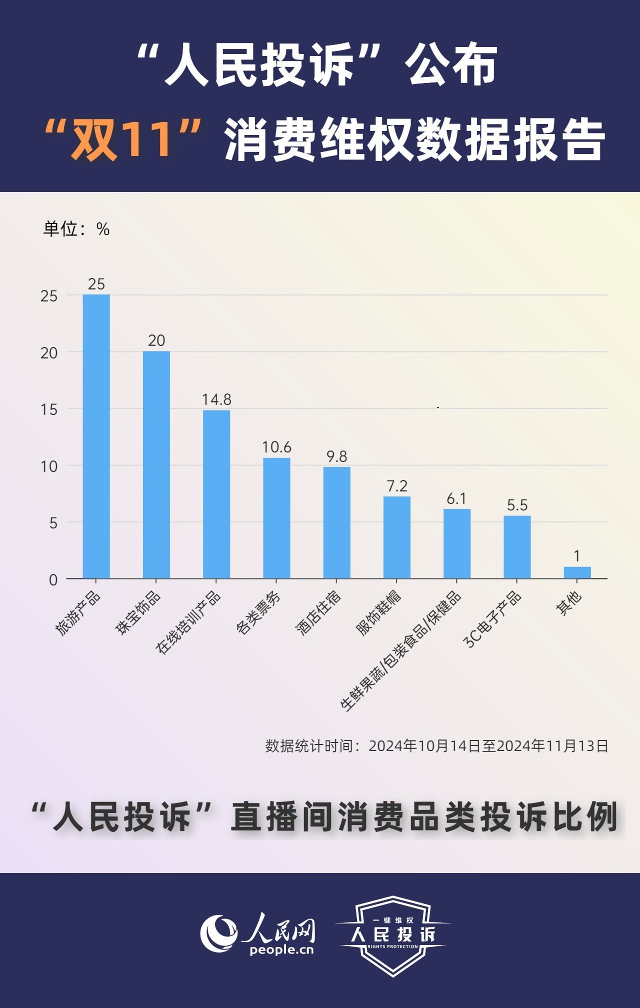 今年“雙11”前夕,人民網(wǎng)“人民投訴”平臺(tái)聯(lián)合人民日報(bào)“讀者來信”版發(fā)起規(guī)范“直播帶貨”問題建議征集活動(dòng)。平臺(tái)數(shù)據(jù)顯示,活動(dòng)上線以來,網(wǎng)友通過各渠道的相關(guān)留言量已超千條?!叭嗣裢对V”分析發(fā)現(xiàn),網(wǎng)友投訴直播消費(fèi)多集中在預(yù)付費(fèi)式旅游產(chǎn)品、在線培訓(xùn)產(chǎn)品、珠寶飾品、服裝鞋帽、電子產(chǎn)品、生鮮食品、酒店服務(wù)、娛樂演出票務(wù)、寵物買賣等消費(fèi)品類。其中,旅游套餐投訴占比25%,珠寶飾品交易投訴占比20%,在線培訓(xùn)投訴占比14.8%,各類票務(wù)投訴占比10.6%,酒店住宿投訴占比9.8%,服飾帽類商品投訴占比7.2%,生鮮果蔬/包裝食品/保健品投訴占比6.1%,3C電子產(chǎn)品投訴占比5.5%。