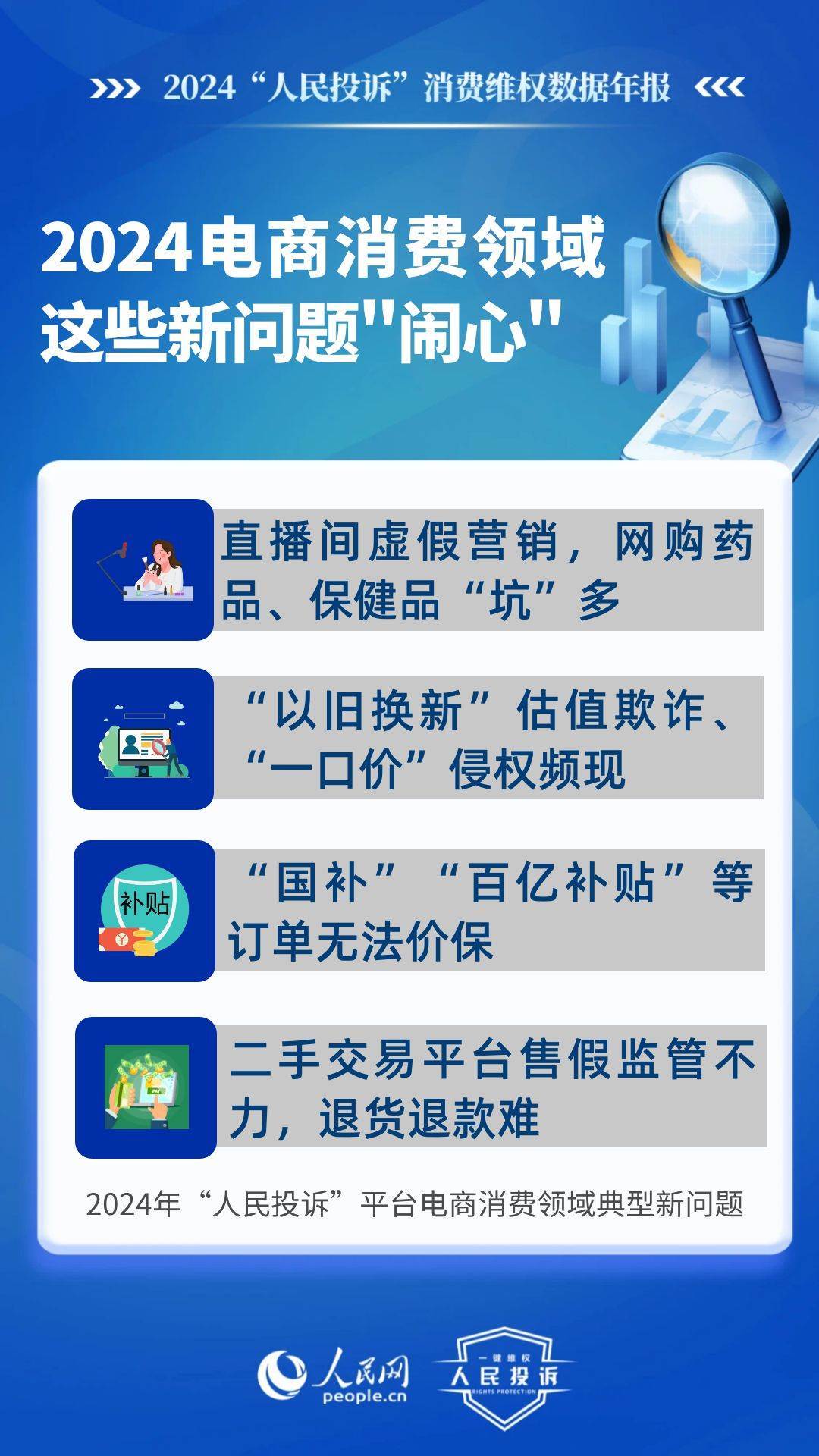 新問題體現(xiàn)在:直播間虛假營銷,購買玉石/網(wǎng)課/旅游產(chǎn)品等消費(fèi)“踩雷”多;“以舊換新”估值欺詐、“一口價(jià)”侵權(quán)頻現(xiàn);“國補(bǔ)”“百億補(bǔ)貼”訂單不給價(jià)保;二手交易平臺(tái)對商家售假監(jiān)管不力、“陰陽”檢測、退貨退款難;網(wǎng)購藥品/保健品/醫(yī)療器械“坑”多等。