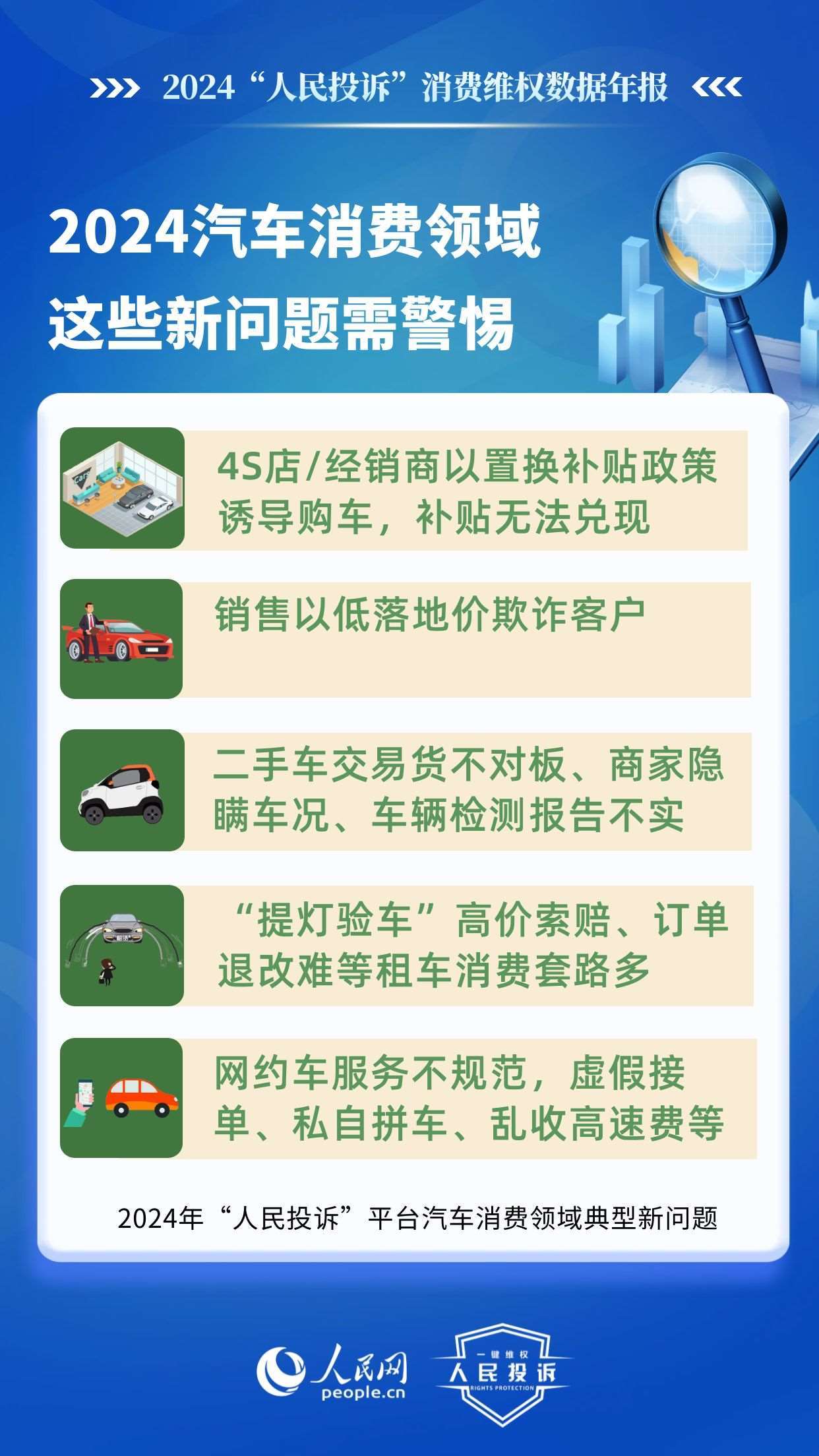 新問題體現(xiàn)在:4S店/經(jīng)銷商以置換補(bǔ)貼政策誘導(dǎo)購車,結(jié)果補(bǔ)貼無法兌現(xiàn);銷售以低落地價(jià)欺詐客戶;二手車交易貨不對板、商家隱瞞車況、平臺(tái)車輛檢測報(bào)告不實(shí);惡意租“故障車”、“提燈驗(yàn)車”高價(jià)索賠、低價(jià)誘租、訂單退改難等租車消費(fèi)套路多;網(wǎng)約車服務(wù)不規(guī)范,人車不符、虛假接單、私自拼車、亂收高速費(fèi)等。