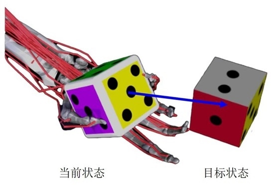 花了大約一周時間熟悉仿生靈巧手的關(guān)節(jié)與肌肉之間的關(guān)系后,他們開始制訂培訓(xùn)這位人工智能“學(xué)生”的方案。抓取、轉(zhuǎn)動骰子,對仿生手來說相當復(fù)雜,他們就將動作拆解,如同體操教練教學(xué)員完成一套復(fù)雜的轉(zhuǎn)體、曲體組合動作時,先教各個分解動作,再進一步完成動作組合。如同水族館表演的海豚,通過獎勵塑造,人工智能在完成目標動作時,一個相當于小魚的獎勵函數(shù)會對它進行“激勵”,以促進其更好地“學(xué)習”。