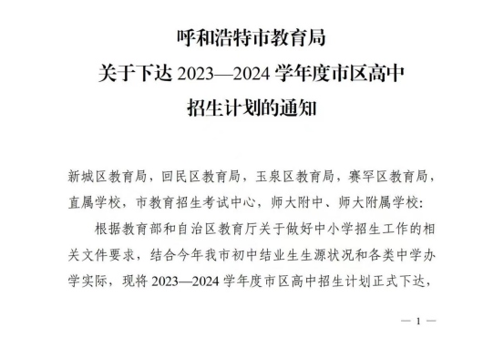 13日,呼和浩特市教育局發(fā)布2023-2024學年度市區(qū)高中招生計劃的通知,同時明確有關要求。