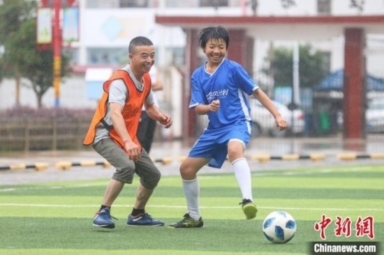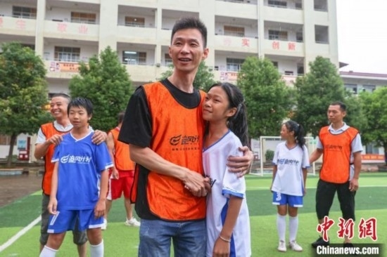 “今天第一次和爸爸踢球,我特別高興和感動(dòng)。他踢得很好,還帶球過了我?guī)状巍N蚁M职忠院竽芏嗯阄姨咔??!?4日,在江西贛州尋烏縣澄江中心校的足球場(chǎng)上,來自該校晨曦女子足球隊(duì)的隊(duì)員廖怡菱和其他四位隊(duì)員在父親節(jié)前夕,驚喜地見到了自己身在外地工作的父親,并第一次和父親一起踢球,進(jìn)行了一場(chǎng)特別的親子足球賽。