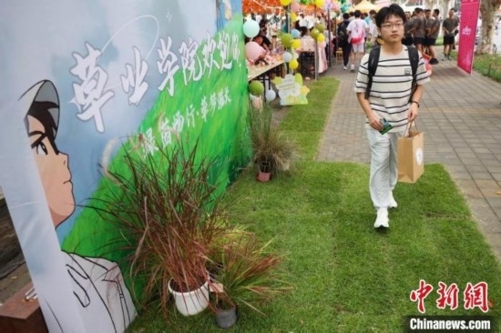 新生從展示的草皮上走過(guò),該草種為南京農(nóng)業(yè)大學(xué)草坪科學(xué)與管理團(tuán)隊(duì)自主培育的藍(lán)光中華結(jié)縷草,葉寬中等,葉色藍(lán)綠,觀賞度高,且耐踐踏,抗旱性強(qiáng),抗病蟲(chóng)能力強(qiáng)。泱波 攝