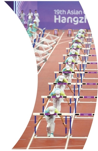 杭州奧體中心體育場內(nèi),志愿者在田徑項目女子七項全能100米欄比賽前準備場地。 新華社記者 江文耀攝