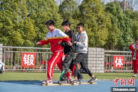 3月19日,兩地學(xué)生一起體驗少數(shù)民族傳統(tǒng)體育項目《板鞋競技》。唐哲 攝