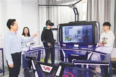 侯精明(左一)與研究生討論VR城市洪澇逃生體驗(yàn)的演示情況。