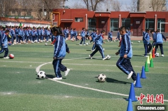 圖為在西寧市大堡子小學(xué),學(xué)生進(jìn)行日常足球訓(xùn)練。馬銘言 攝