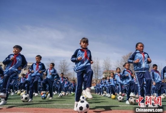 圖為在西寧市大堡子小學(xué),學(xué)生進(jìn)行足球特色大課間展示。馬銘言 攝