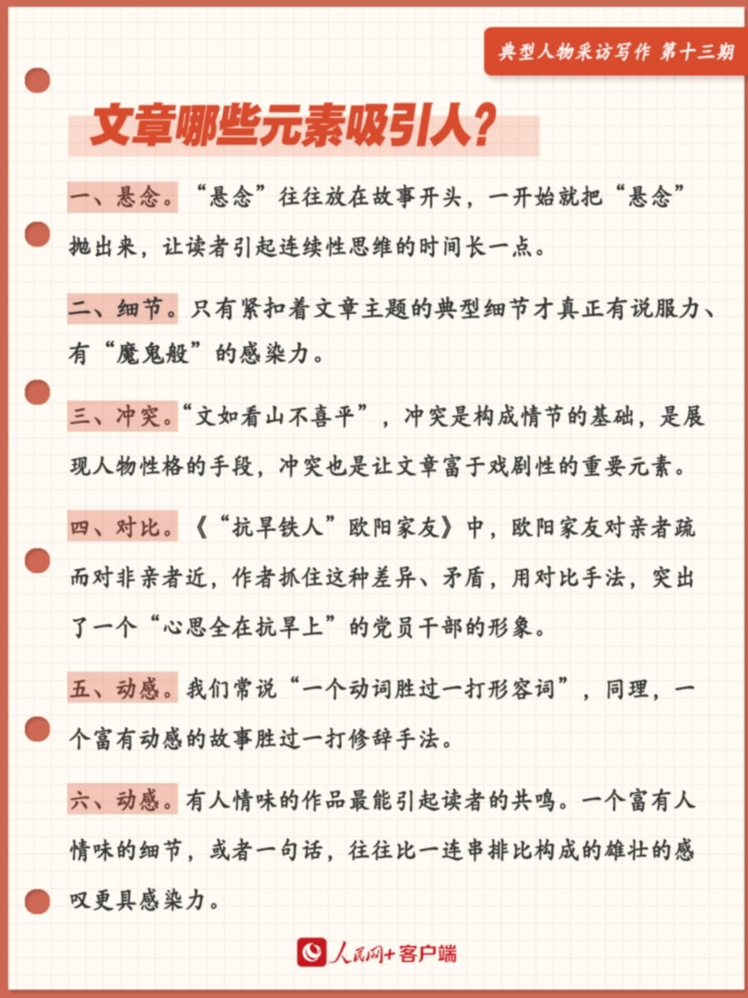 元素不是部件,一篇好看的稿件,也許只需用好一兩個元素,也許得多種元素交替運用。上述梳理只涉及部分元素,倘若全面分析文章抓人的元素,還有很多。