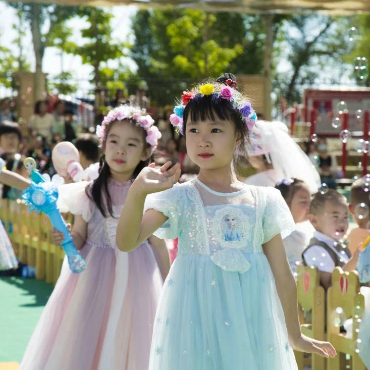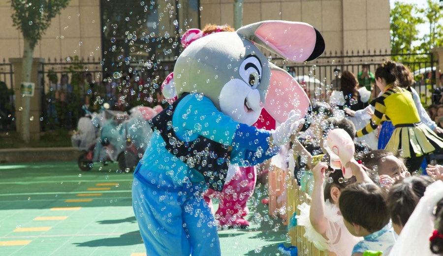 當(dāng)日,打扮成迪士尼童話(huà)里人物的老師們與盛裝打扮的小朋友們,共同手持泡泡機(jī),在晶瑩剔透的泡泡里一起沉浸在童話(huà)世界里。