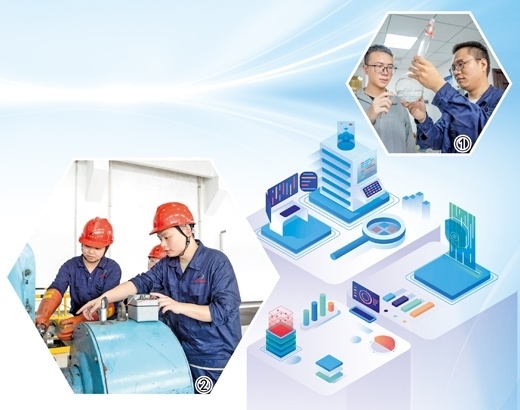 圖①:東港熱電公司博士創(chuàng)新站博士(左)與企業(yè)員工討論實驗反應結(jié)果。圖②:東港熱電公司員工(右)帶領參與博士創(chuàng)新站實踐工作的大學生檢修設備。