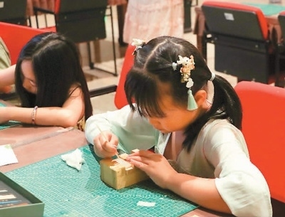 在四層的非遺手工藝體驗中心,許多小朋友正在興致勃勃地體驗古法制玉、敦煌石粉彩繪技藝(壁畫臨?。?、紙箋加工技藝(流沙箋團扇制作)等非遺項目。一位小朋友正在美美地擺弄著自己親手制作的流沙箋團扇。她的母親許女士介紹說,這些項目雖然看著傳統(tǒng)但其實非常時尚,孩子很喜歡這些手工項目,覺得很有趣;帶孩子在博物館里看展覽還能做手工,是一項很有意義的體驗。