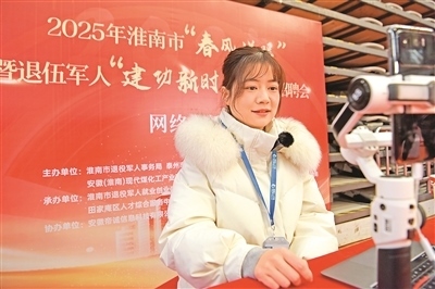 近日,安徽省淮南市舉行2025年“春風(fēng)送暖”大型招聘會,351家企業(yè)提供近萬個(gè)工作崗位。圖為一名主播在招聘會現(xiàn)場進(jìn)行網(wǎng)絡(luò)直播助力就業(yè)。