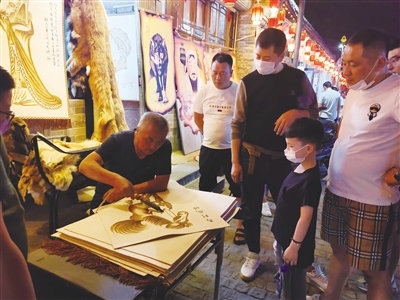 在老街上一些具有民族特色的皮畫店、皮包店也成為了人們駐足消費、觀賞的熱點商鋪。在一家皮畫店,皮畫師在現場制作皮畫,看著精美的圖案被皮畫師一筆一筆地勾勒出來,不少市民都忍不住停下腳步?!皫Ш⒆映鰜黹e逛,看到皮畫孩子主動提出來要看,皮畫是咱們呼市特有的,現場制作,能讓更多人了解制作過程,了解皮畫,挺好的。”市民周先生說。