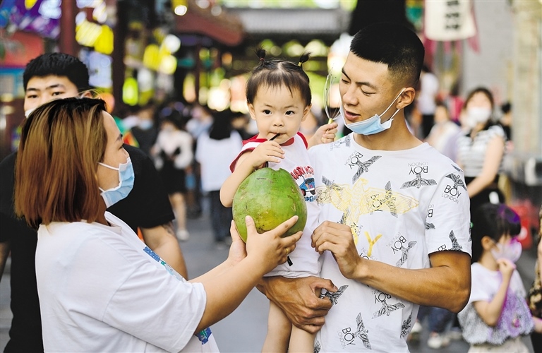 6月18日,呼和浩特市民在玉泉區(qū)通順大巷小吃街上品嘗椰子汁。當(dāng)日,2022年塞上老街音樂美食季在呼和浩特市玉泉區(qū)開幕。今年的音樂美食季活動(dòng)共分為阿拉坦汗廣場(chǎng)、大召前街等六大活動(dòng)區(qū)塊,推出啤酒節(jié)、美食季、快閃店、后備箱集市等八大主題活動(dòng),助力首府夜經(jīng)濟(jì)發(fā)展、夜消費(fèi)繁榮,活動(dòng)將持續(xù)到9月底。(記者 王磊 攝)