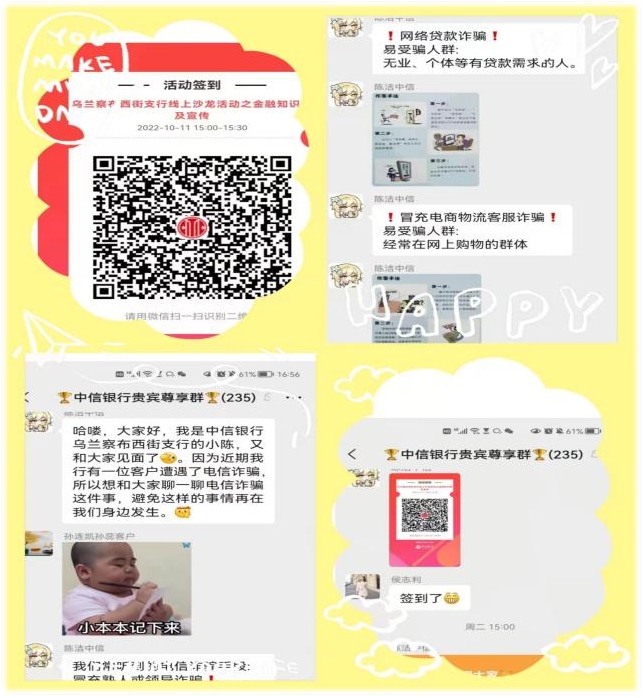 該行各網(wǎng)點組織開展“防范電信詐騙——中信銀行守護您的金融安全”主題線上沙龍活動,300余人積極參與,進一步提高公眾金融素養(yǎng)。同時,該行充分利用線上宣傳渠道,通過專業(yè)人員講解、互動提問答題、電子宣傳手冊等方式,向社會公眾宣傳電信詐騙知識。并對學(xué)生、老年人等易受騙群體進行針對性反詐警示教育,揭露電信詐騙犯罪手法和危害,以及教授如何識別、如何應(yīng)對、防止上當(dāng)受騙等方法。