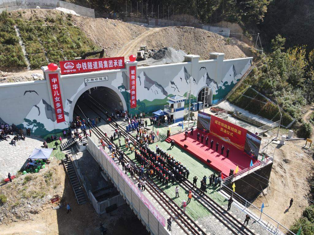 小相嶺隧道口的成昆鐵路復(fù)線軌道貫通儀式現(xiàn)場。(中國鐵路成都局集團(tuán)公司供圖)