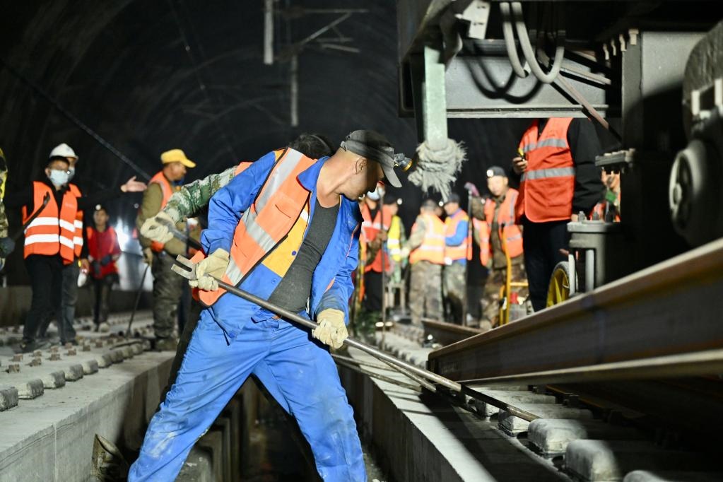 建設(shè)者們在完成全線鋼軌的最后鋪架。(中國鐵路成都局集團(tuán)公司供圖)