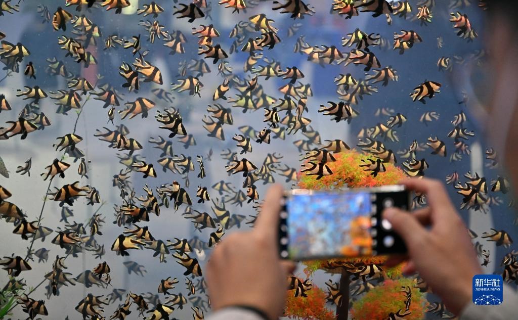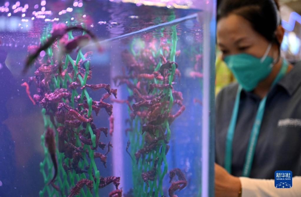 12月15日,觀眾在參觀海南文昌展臺展示的養(yǎng)殖海馬。新華社記者 郭程 攝