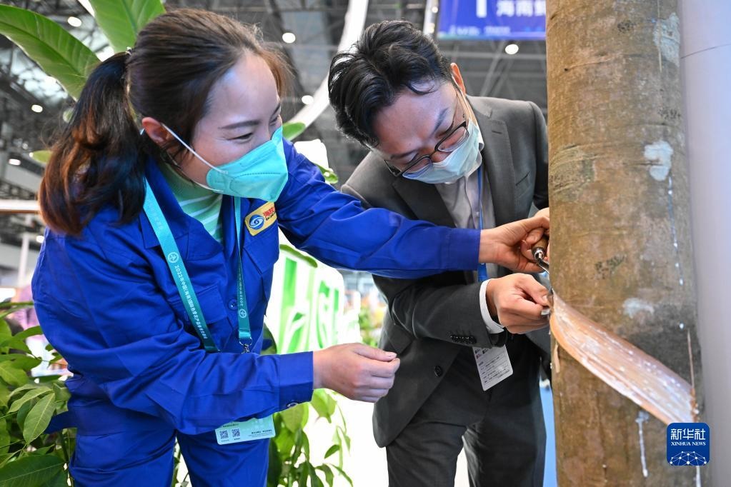 12月15日,觀眾在工作人員的指導(dǎo)下體驗割膠。新華社記者 郭程 攝