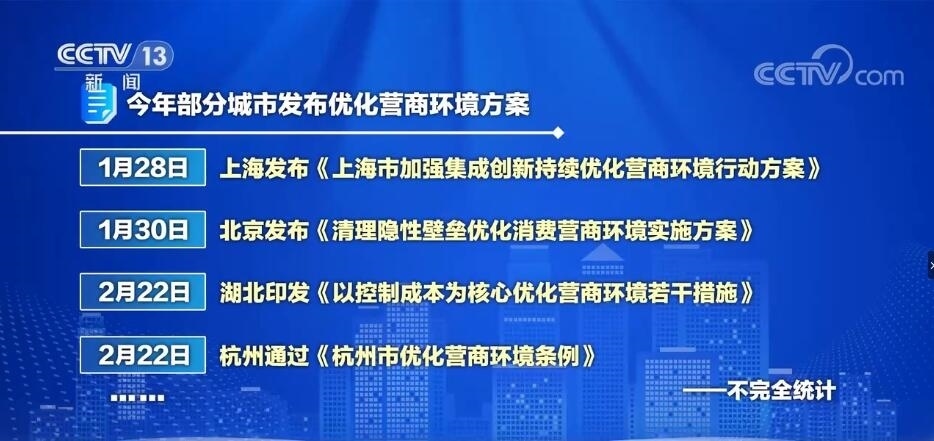解說(shuō):同樣是在1月28日,吉林省將營(yíng)商環(huán)境作為年度重點(diǎn)工作之一,民營(yíng)經(jīng)濟(jì)大省福建舉行了民營(yíng)經(jīng)濟(jì)代表人士座談會(huì),上海更是將優(yōu)化營(yíng)商環(huán)境建設(shè)作為開年第一會(huì)的主題。