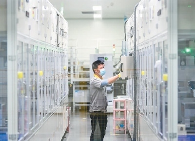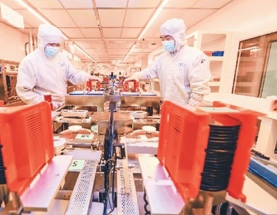 2023年2月16日,在安徽省馬鞍山市經濟開發(fā)區(qū)檳城電子有限公司半導體芯片生產線上,職工在趕制應用于5G基站上的半導體芯片。王文生攝(人民圖片)