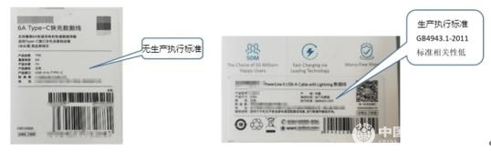 5.46款樣品有36款明示了生產執(zhí)行標準,10款未明示生產執(zhí)行標準。明示的標準絕大多數為企業(yè)標準,少數為已過時效期的行業(yè)標準,或與數據線產品無相關性的安全標準。