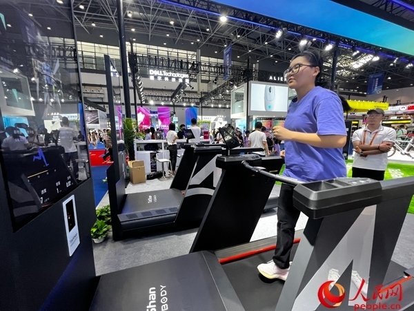 觀眾在消博會現(xiàn)場體驗3D智能專業(yè)跑步機。人民網(wǎng)記者 張力洋攝