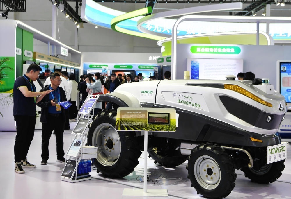 在第六屆數(shù)字中國建設(shè)峰會智慧農(nóng)業(yè)展廳展出的新能源無人駕駛智能拖拉機吸引參觀者駐足觀看(4月26日攝)。新華社記者 魏培全 攝