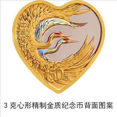 3克心形金質(zhì)“比翼雙飛”紀念幣背面圖案為雙鶴齊飛裝飾組合圖案,并刊“比翼雙飛”字樣及面額。