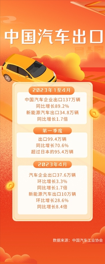 中國(guó)汽車工業(yè)協(xié)會(huì)的統(tǒng)計(jì)數(shù)據(jù)顯示,今年第一季度,國(guó)內(nèi)汽車企業(yè)出口99.4萬輛,同比增長(zhǎng)70.6%,超過日本的95.4萬輛。最新數(shù)據(jù)顯示,4月份,出口37.6萬輛,同比增長(zhǎng)1.7倍,其中,電動(dòng)、混動(dòng)等新能源汽車出口10萬輛,環(huán)比增長(zhǎng)28.6%,同比增長(zhǎng)8.4倍,保持良好勢(shì)頭。
