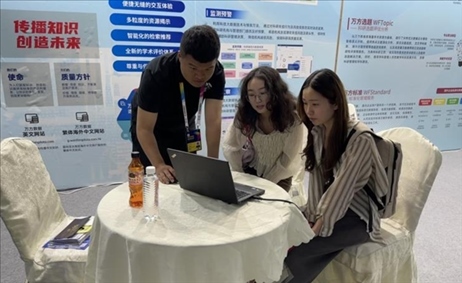 萬方數(shù)據(jù)工作人員現(xiàn)場為用戶進行產(chǎn)品演示。(受訪者供圖)