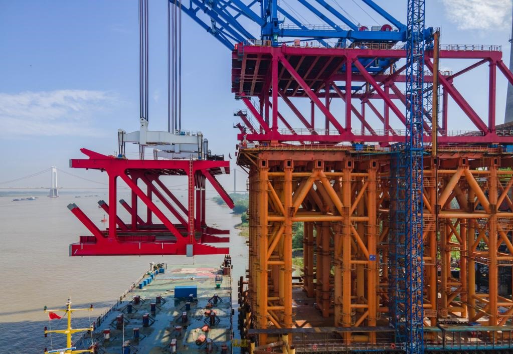 5月28日,馬鞍山長(zhǎng)江公鐵大橋正在進(jìn)行主汊航道橋南側(cè)首節(jié)段鋼桁梁吊裝(無(wú)人機(jī)照片)。新華社發(fā)(羅繼勝 攝)