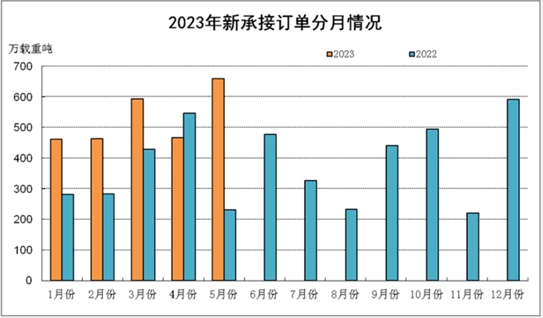 2023年1-5月新承接訂單分月統(tǒng)計(jì)。 來源:中國船舶工業(yè)行業(yè)協(xié)會(huì)
