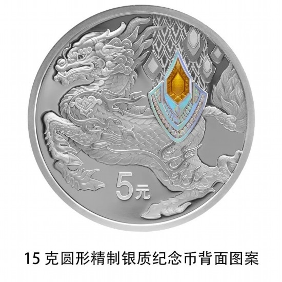 15克圓形銀質(zhì)紀念幣背面圖案為龍造型,并刊面額。