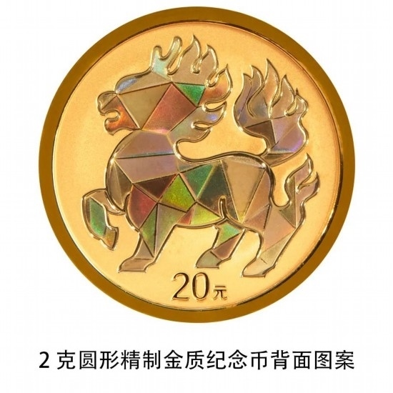 2克圓形金質(zhì)紀念幣背面圖案為裝飾麒麟造型,并刊面額。