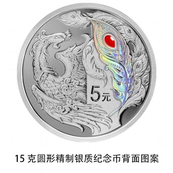 15克圓形銀質(zhì)紀念幣背面圖案為鳳凰造型,并刊面額。