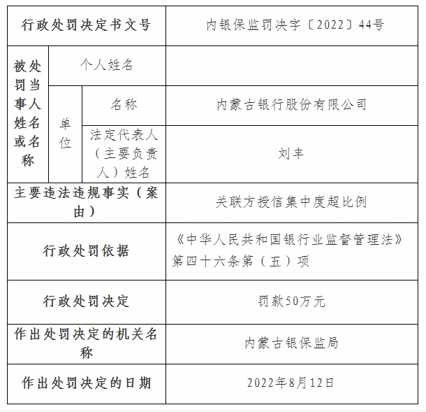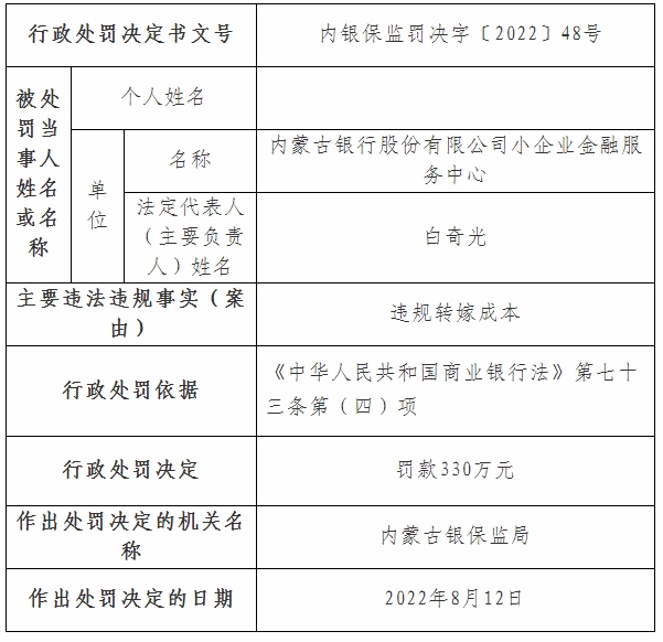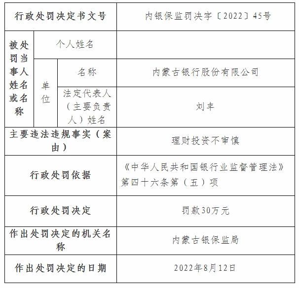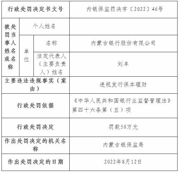 其中內(nèi)銀保監(jiān)罰決字〔2022〕44號(hào)、45號(hào)、46號(hào)行政處罰信息公開表顯示,內(nèi)蒙古銀行因關(guān)聯(lián)方授信集中度超比例、理財(cái)投資不審慎、違規(guī)發(fā)行保本理財(cái),分別被罰款50萬(wàn)元、30萬(wàn)元、50萬(wàn)元;內(nèi)銀保監(jiān)罰決字〔2022〕47號(hào)行政處罰信息公開表顯示,內(nèi)蒙古銀行呼和浩特分行違規(guī)掩蓋資產(chǎn)質(zhì)量,被罰款50萬(wàn)元;內(nèi)銀保監(jiān)罰決字〔2022〕48號(hào)行政處罰信息公開表顯示,內(nèi)蒙古銀行小企業(yè)金融服務(wù)中心因違規(guī)轉(zhuǎn)嫁成本,被罰款330萬(wàn)元。