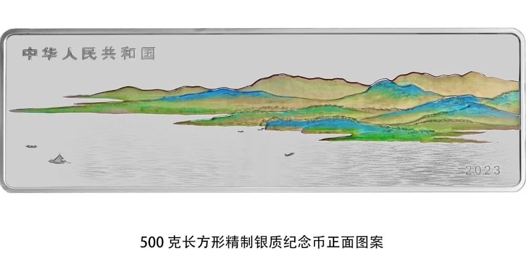 500克長方形銀質(zhì)紀(jì)念幣正面圖案為山、水等組合設(shè)計(jì),并刊國名、年號(hào)。