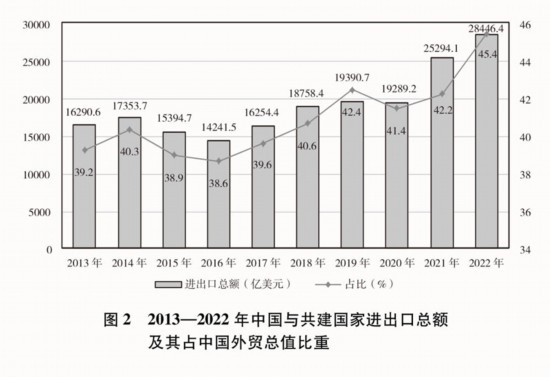 貿(mào)易投資規(guī)模穩(wěn)步擴(kuò)大。2013-2022年,中國與共建國家進(jìn)出口總額累計(jì)19.1萬億美元,年均增長6.4%;與共建國家雙向投資累計(jì)超過3800億美元,其中中國對外直接投資超過2400億美元;中國在共建國家承包工程新簽合同額、完成營業(yè)額累計(jì)分別達(dá)到2萬億美元、1.3萬億美元。2022年,中國與共建國家進(jìn)出口總額近2.9萬億美元,占同期中國外貿(mào)總值的45.4%,較2013年提高了6.2個(gè)百分點(diǎn);中國民營企業(yè)對共建國家進(jìn)出口總額超過1.5萬億美元,占同期中國與共建國家進(jìn)出口總額的53.7%。