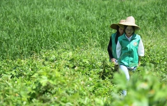 增城區(qū)一處農(nóng)田,種糧大戶沈燕芬(前)查看禾苗長(zhǎng)勢(shì)。新華社記者鄧華 攝